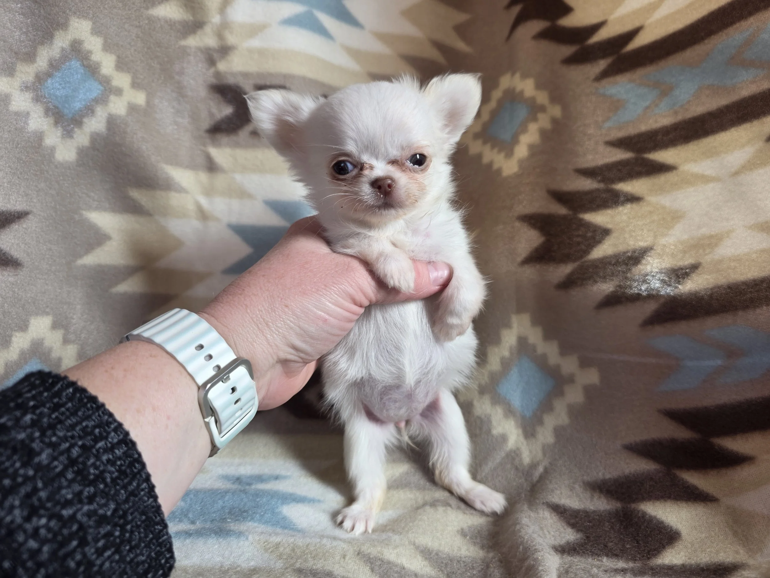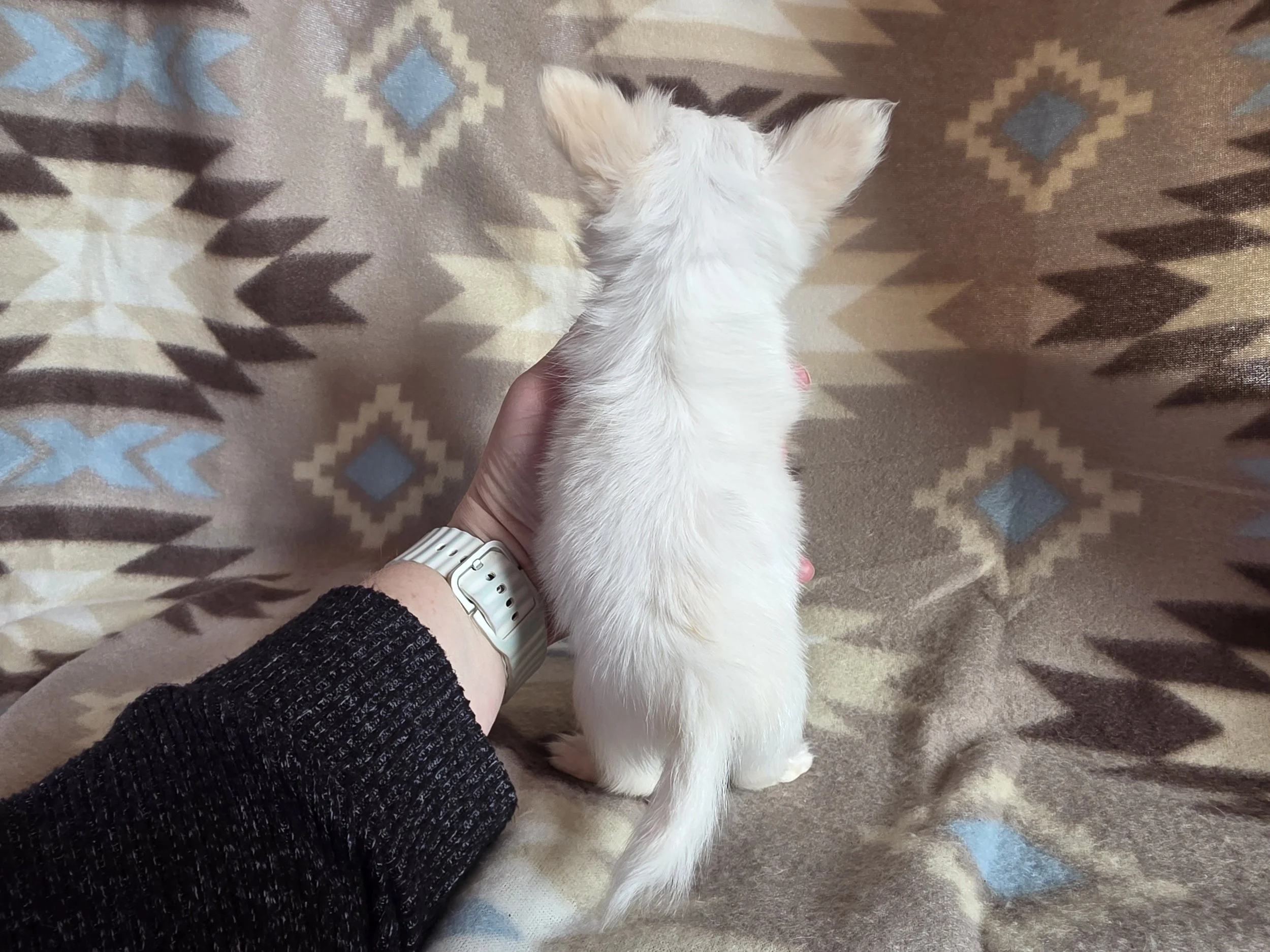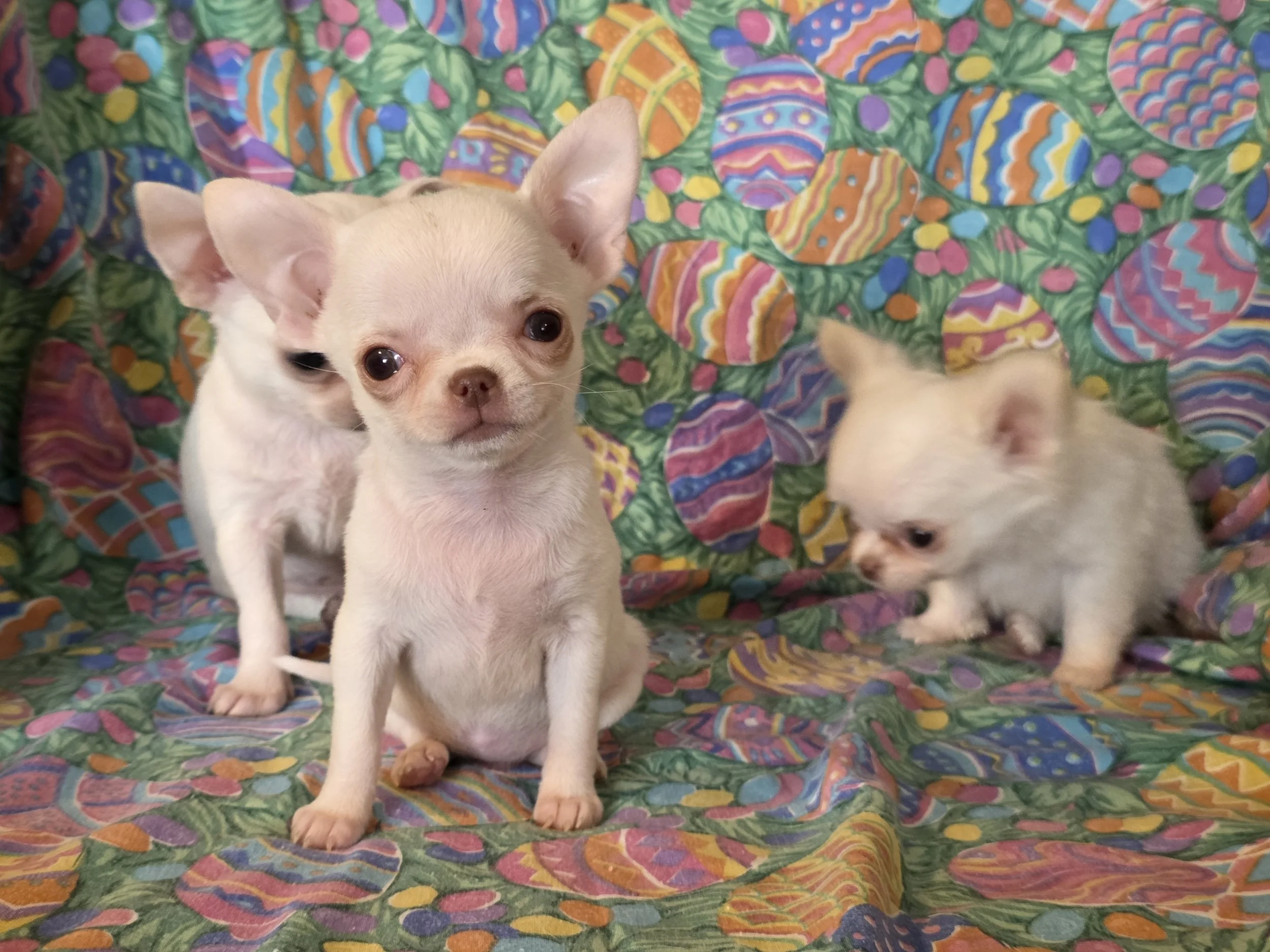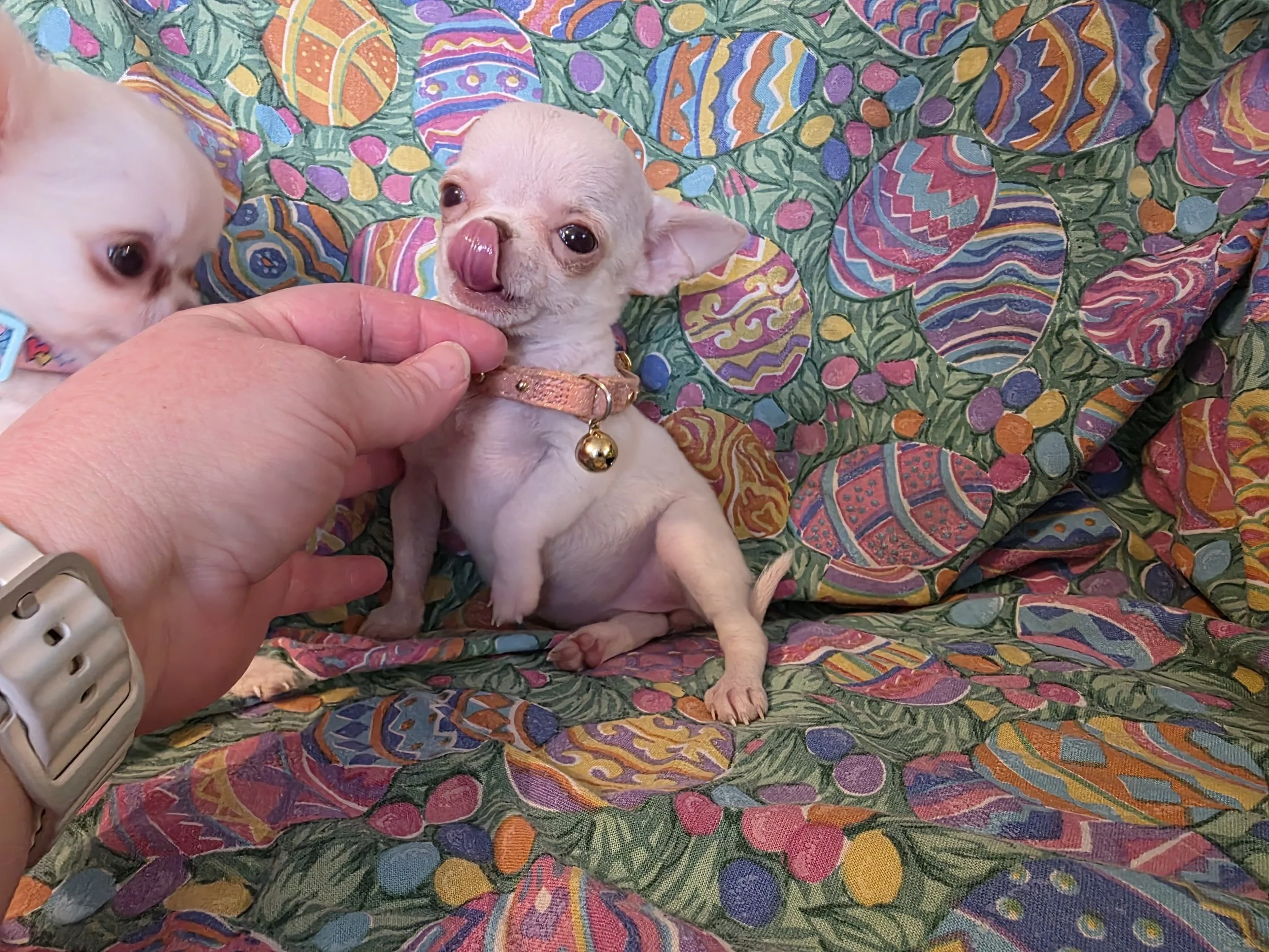 Tinkerbelle is a perfectly tiny cream smooth coat AKC female.