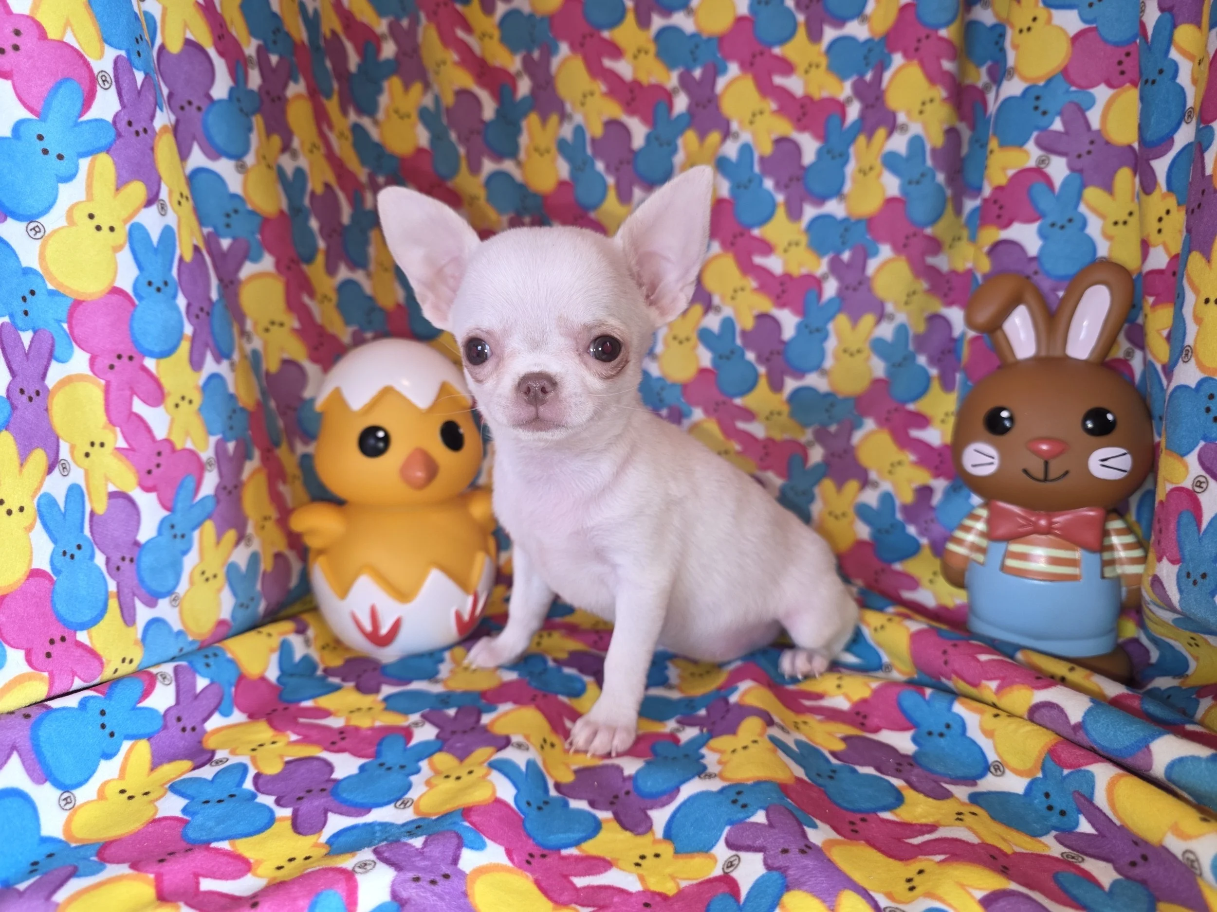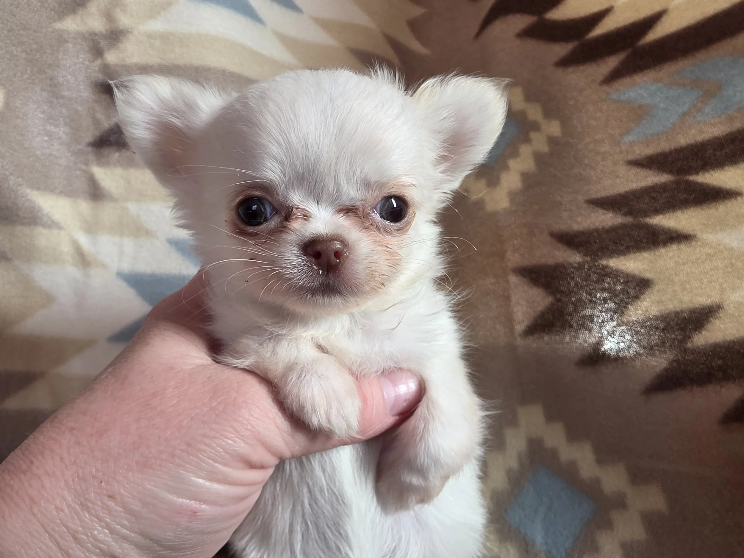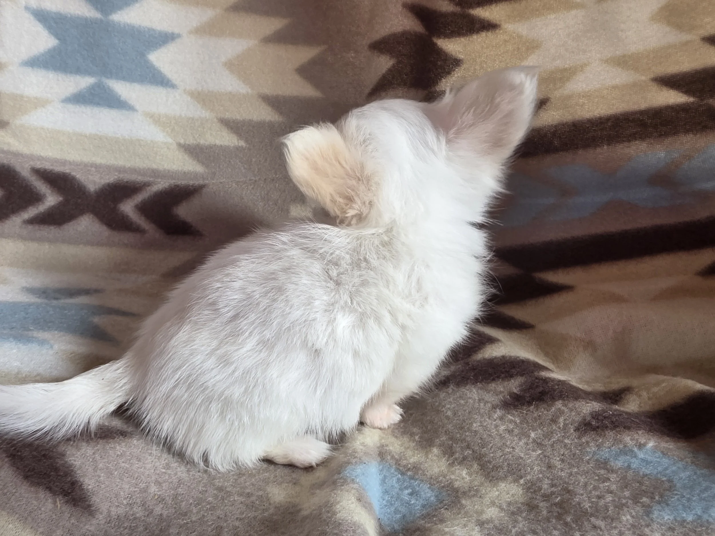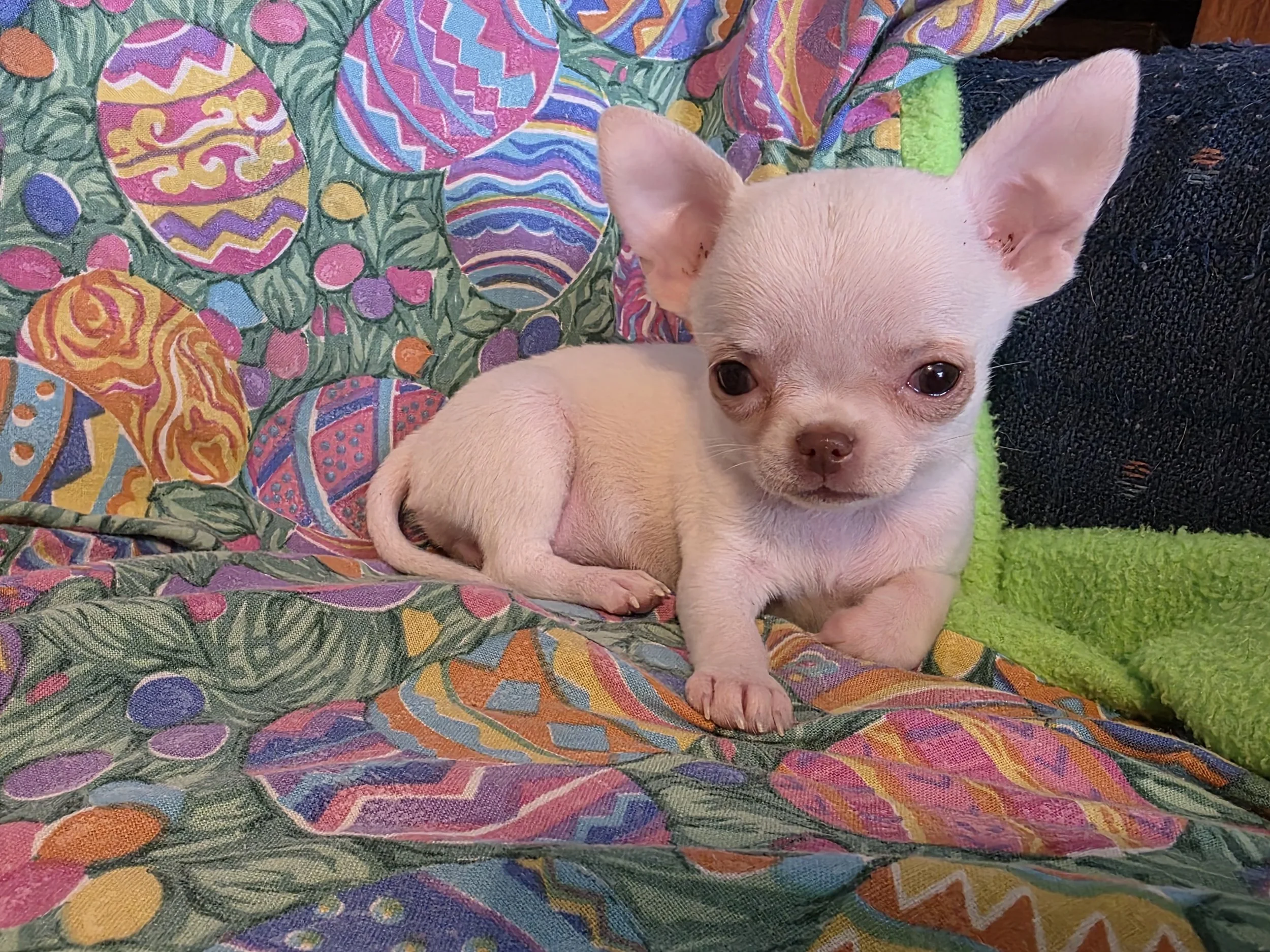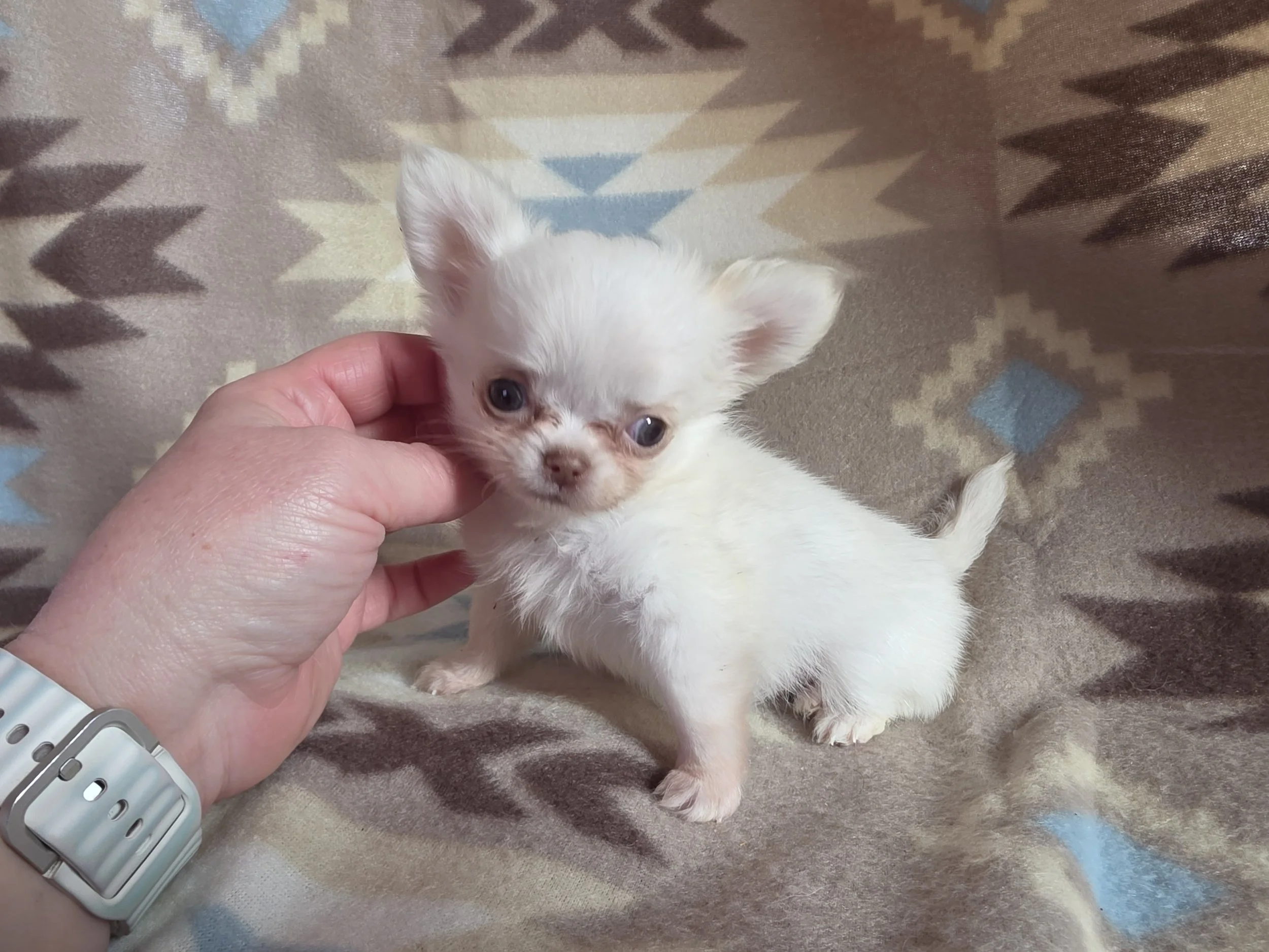 Tinkerbelle is a perfectly tiny cream smooth coat AKC female.