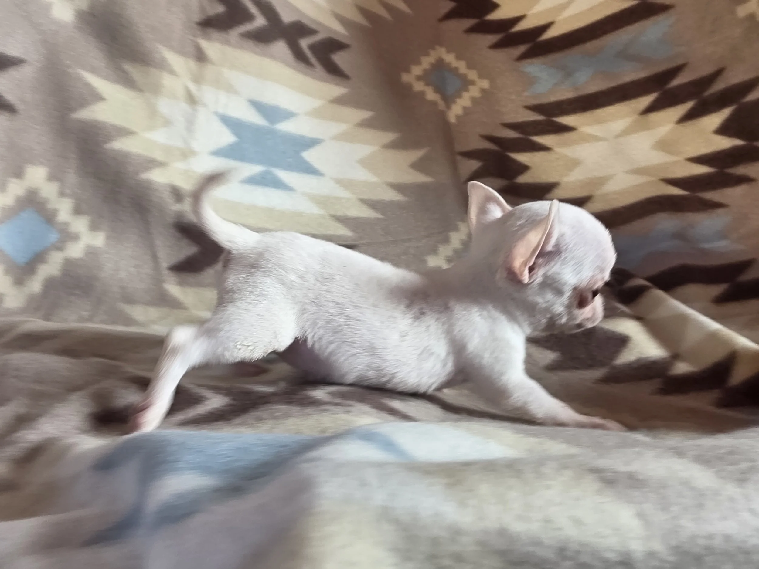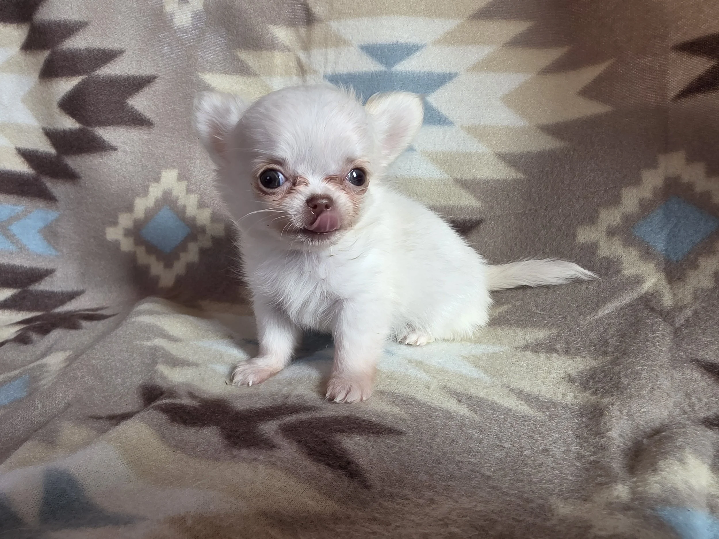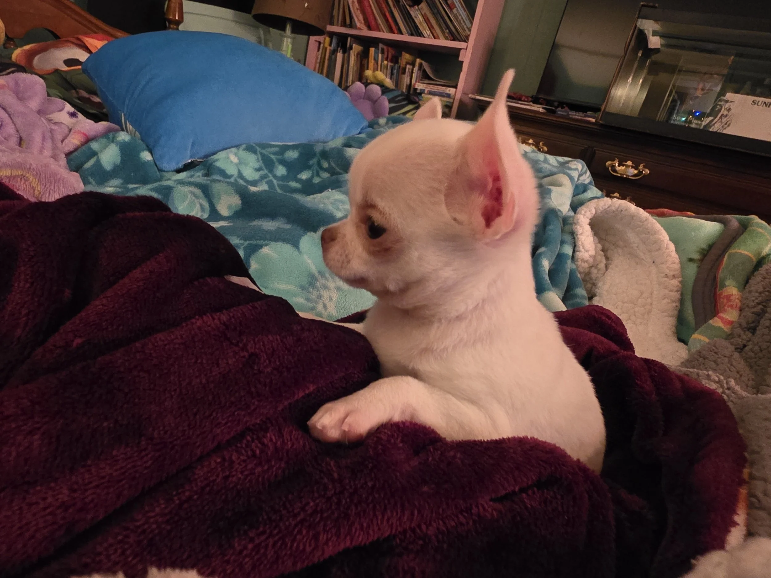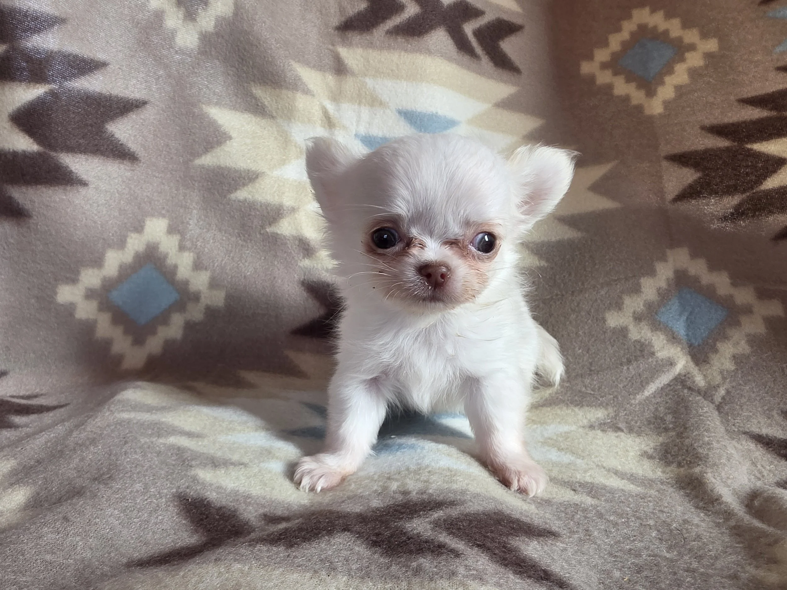 Tinkerbelle is a perfectly tiny cream smooth coat AKC female.